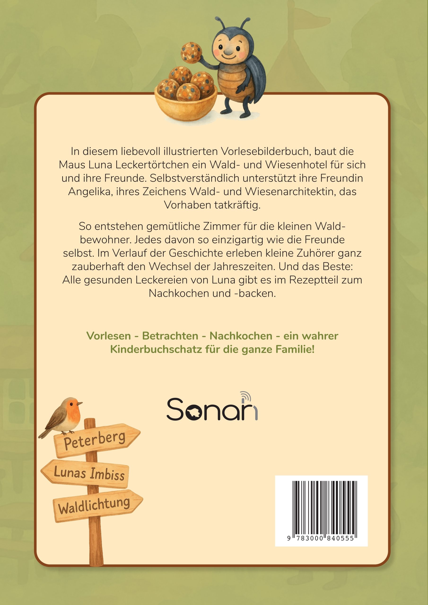 In diesem liebevoll illustrierten Vorlesebilderbuch, baut die Maus Luna Leckertörtchen ein Wald- und Wiesenhotel für sich und ihre Freunde. Selbstverständlich unterstützt ihre Freundin Angelika, ihres Zeichens Wald- und Wiesenarchitektin, das Vorhaben tatkräftig. So entstehen gemütliche Zimmer für die kleinen Waldbewohner. Jedes davon so einzigartig wie die Freunde selbst. Im Verlauf der Geschichte erleben kleine Zuhörer ganz zauberhaft den Wechsel der Jahreszeiten. Und das Beste: Alle gesunden Leckereien von Luna gibt es im Rezeptteil zum Nachkochen und -backen.